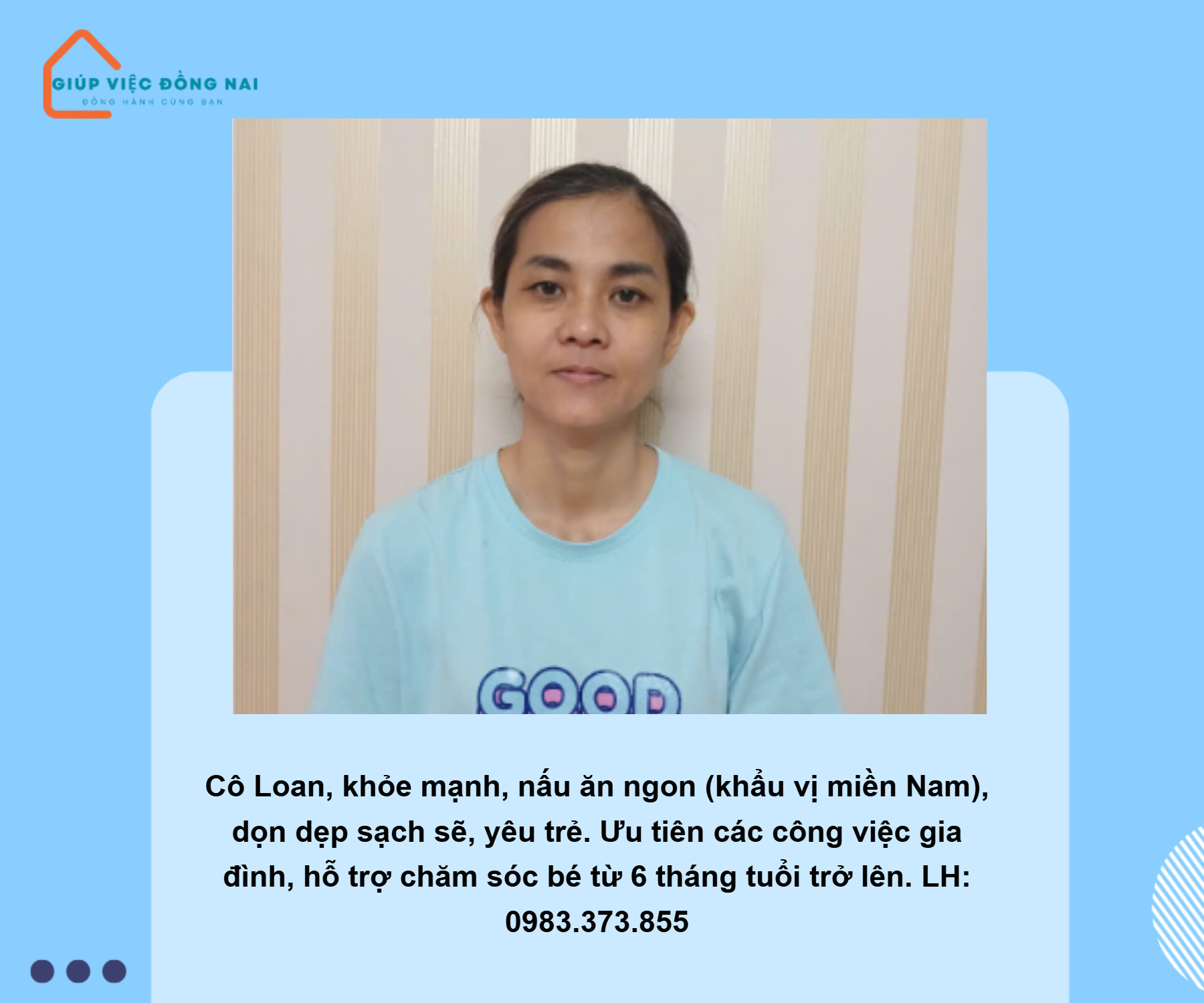 + Thiện chí đi làm, chị mong muốn tìm được gia chủ tốt bụng và gắn bó lâu dài