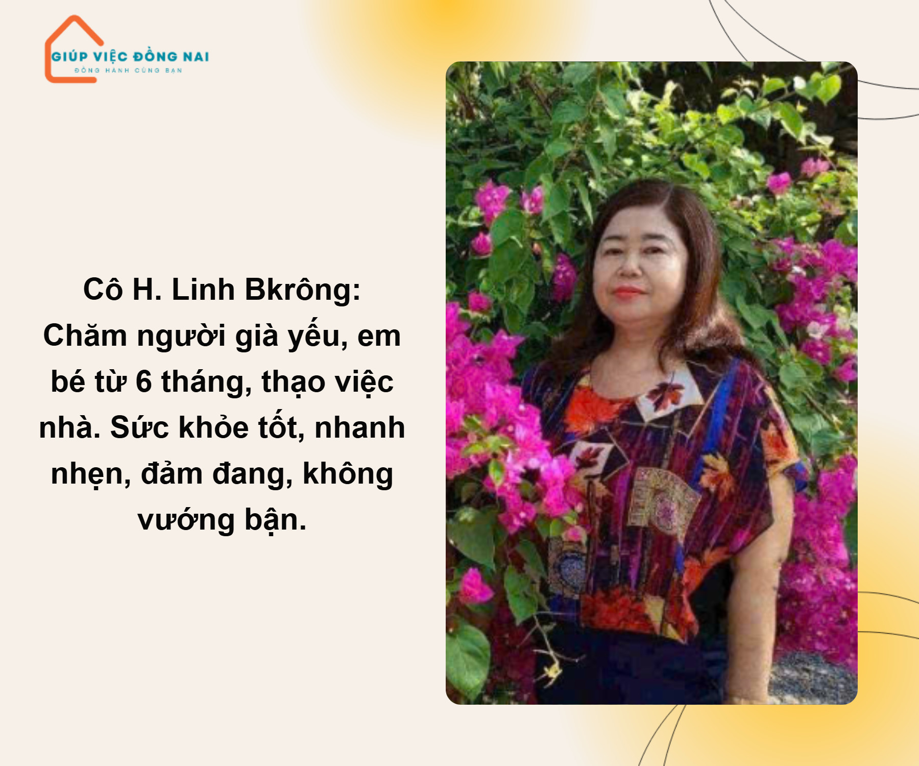 Kinh nghiệm: + Chăm bà nằm 1 chỗ ở Bình Phước đến khi bà mất + Chăm ông nằm 1 chỗ ở HCM được 2 năm ông mất nên cô nghỉ + Giúp việc nhà ở Bình Phước 3 năm + Giúp việc nhà ở Quận 2 được 2 năm + Chăm bé 10 tháng ở Bình Phước đến khi bé lớn Ưu điểm: + Chuyên chăm ông bà bị tai biếm nằm một chỗ, bệnh, lẫn. Cho ông bà ăn, vệ sinh, tối dậy thay bỉm vệ sinh, dắt ông bà đi tiểu tiện. Chị biết cách dỗ dành ông bà, nói chuyện tâm sự với ông bà, lấy thuốc ông bà uống, vệ sinh phòng ông bà sạch sẽ. Biết cách giữ gìn và chăm nom ông bà, chăm sóc tận tình tận tâm + Chăm được em bé từ 6 tháng, làm những việc liên quan đến bé..cho bú, ru ngủ, chơi với bé. + Sức khỏe chị rất tốt, nhà rộng , chung cư hay nhà 2 3 lầu chị làm được. + Giỏi công việc nhà, chăm sóc cho gia đình tốt, tỉ mỉ, cẩn thận, làm việc nhanh chóng, gọn gàng, sạch sẽ, ngăn nắp, biết sắp xếp, chủ động trong công việc, để giữ cho nhà cửa sạch sẽ, ủi đồ đẹp. + Nhà có em bé lớn đi học chị phụ lo cơm nước, tắm rửa và quần áo cho bé đi học đều được. + Biết đi xe máy có thể hỗ trợ đi chợ, mua đồ dùng cần thiết, phụ đưa đón bé đi học.