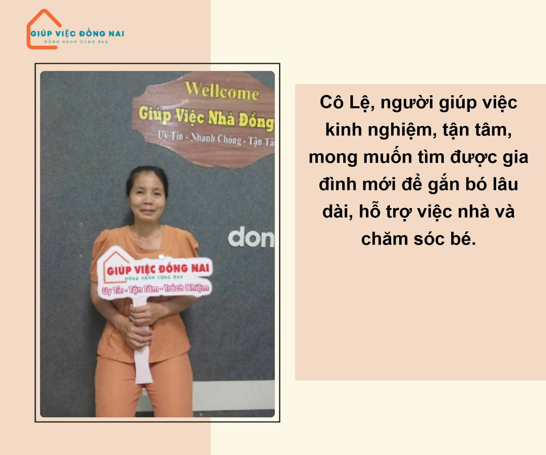 Kinh nghiệm: - Giúp việc nhà ở quận 7 được 2 năm - Giúp việc nhà phụ chăm bé ở Thủ Đức được 2 năm Ưu điểm: + Tính tình hiền lành, vui vẻ, hoà nhã với mọi người, biết lắng nghe và tiếp thu ý kiến từ gia đình. + Sức khỏe tốt, chị làm được nhà chung cư hoặc nhà phố 2 lầu. + Tự tin nấu ăn theo khẩu vị miền Nam – Tây , điều chỉnh được theo khẩu vị chủ nhà yêu cầu, nấu được đa dạng các món, biết nấu các món ăn sáng. + Chị làm việc chủ động, tự giác, biết cách sắp xếp công việc hợp lý. Các thiết bị thông minh hướng dẫn qua 1 lần chị sử dụng được. + Chị thương con nít, khi rảnh chị phụ giúp bố mẹ chăm như đút ăn, thay bỉm tả…ru ngủ cho bé ăn uống đúng giờ, vệ sinh kĩ. Nhà có bé lớn đi học về chị hỗ trợ tắm rửa cơm nước được. + Mong muốn tìm được gia đình phù hợp để chị đi làm gắng bó lâu dài