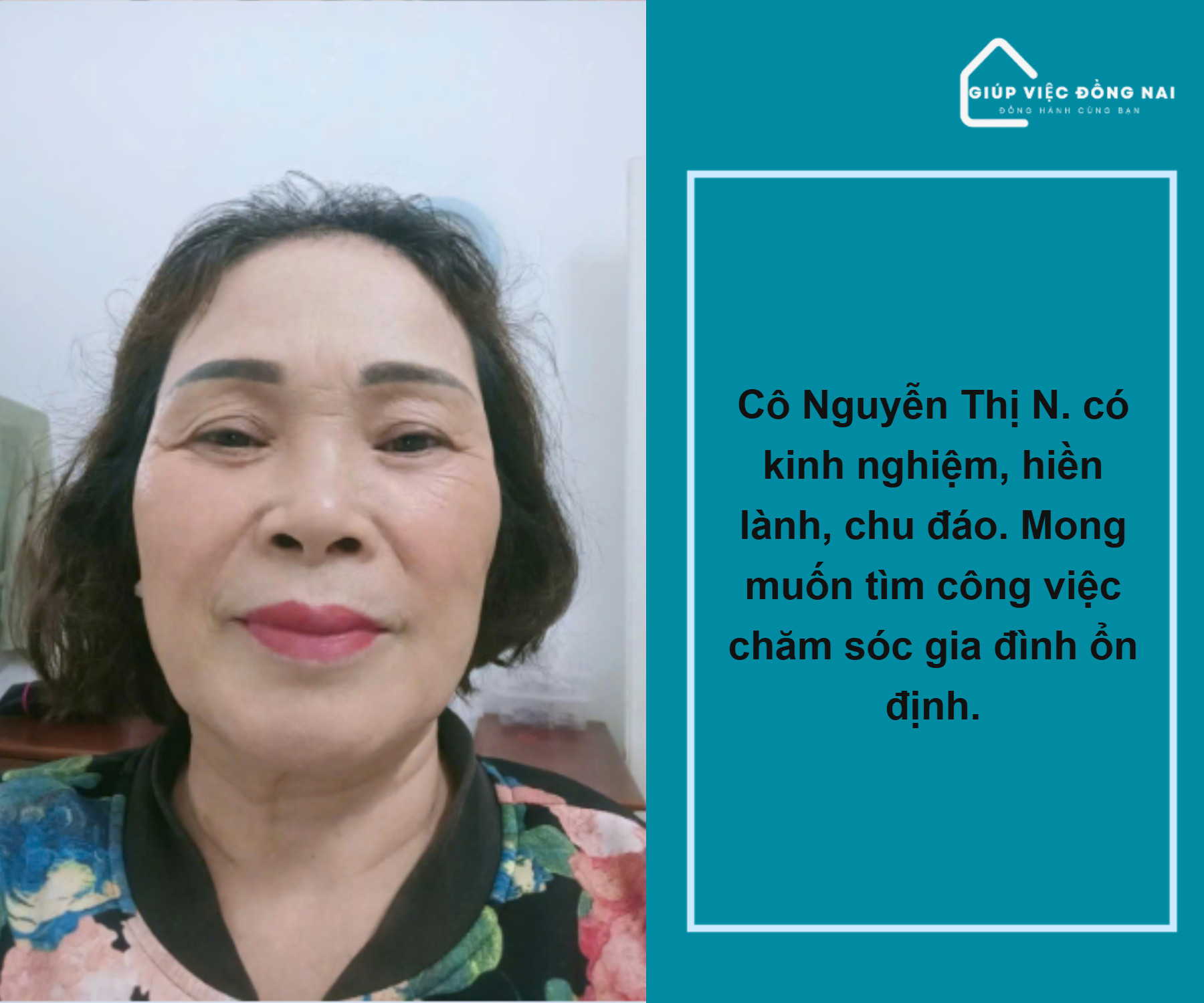 Kinh nghiệm: + Chăm bà bệnh nằm 1 chỗ tại Đồng Nai được 5 năm + Nội trợ lâu năm trong gia đình Ưu điểm: + Cô tính tình hiền lành chịu thương chịu khó làm việc chu toàn trong gia đình, rất vui vẻ nhiệt tình, nên có việc là làm liền. + Biết cách cho ăn uống theo giờ giấc và chế độ dinh dưỡng cho ông bà, có thể dìu dắt ông bà tập đi lại, đút ăn, thay bỉm vệ sinh sạch sẽ đảm bảo sức khỏe tốt cho ông bà + Có thể trò chuyện tâm sự để ông bà đỡ chán, uống thuốc men theo đúng giờ giấc gia đình đưa ra + Rất yêu thương người lớn tuổi quan tâm chăm sóc chu đáo cần mẫn, hiểu được tâm lý người lớn tuổi + Sức khỏe cô rất tốt có thể thức khuya dậy sớm chăm sóc ông bà, có thể làm được nhà lầu không ngại công việc khó + Mong muốn công việc gắn bó làm việc ổn định và tận tâm cho gia đình