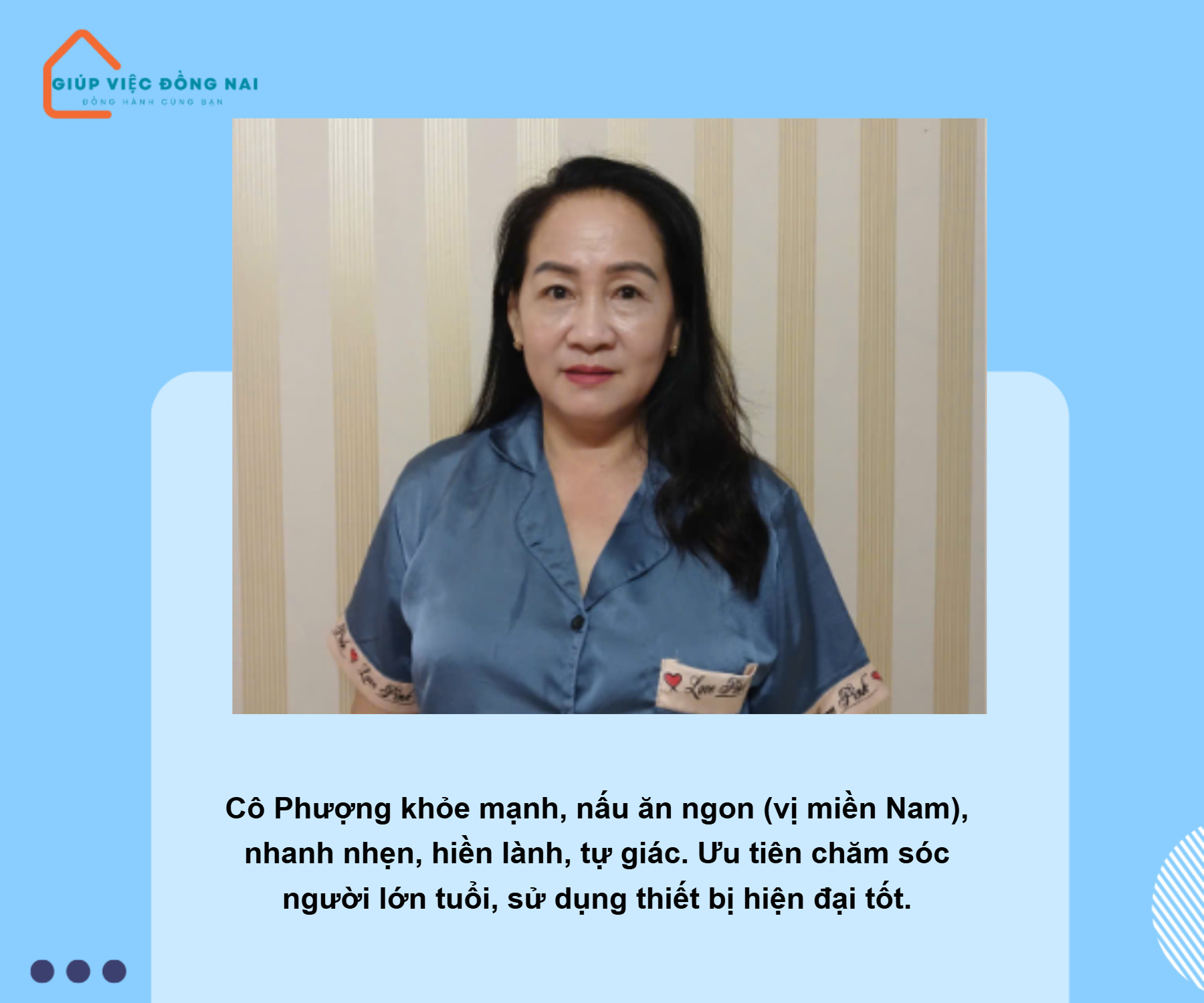 + Chị là người hiểu chuyện, hiểu tâm lý người lớn tuổi, biết cách quan tâm săn sóc cho các bác, Biết cách trò chuyện cho ông bà ăn, uống thuốc đúng giờ. Tối ngủ đêm với ông bà