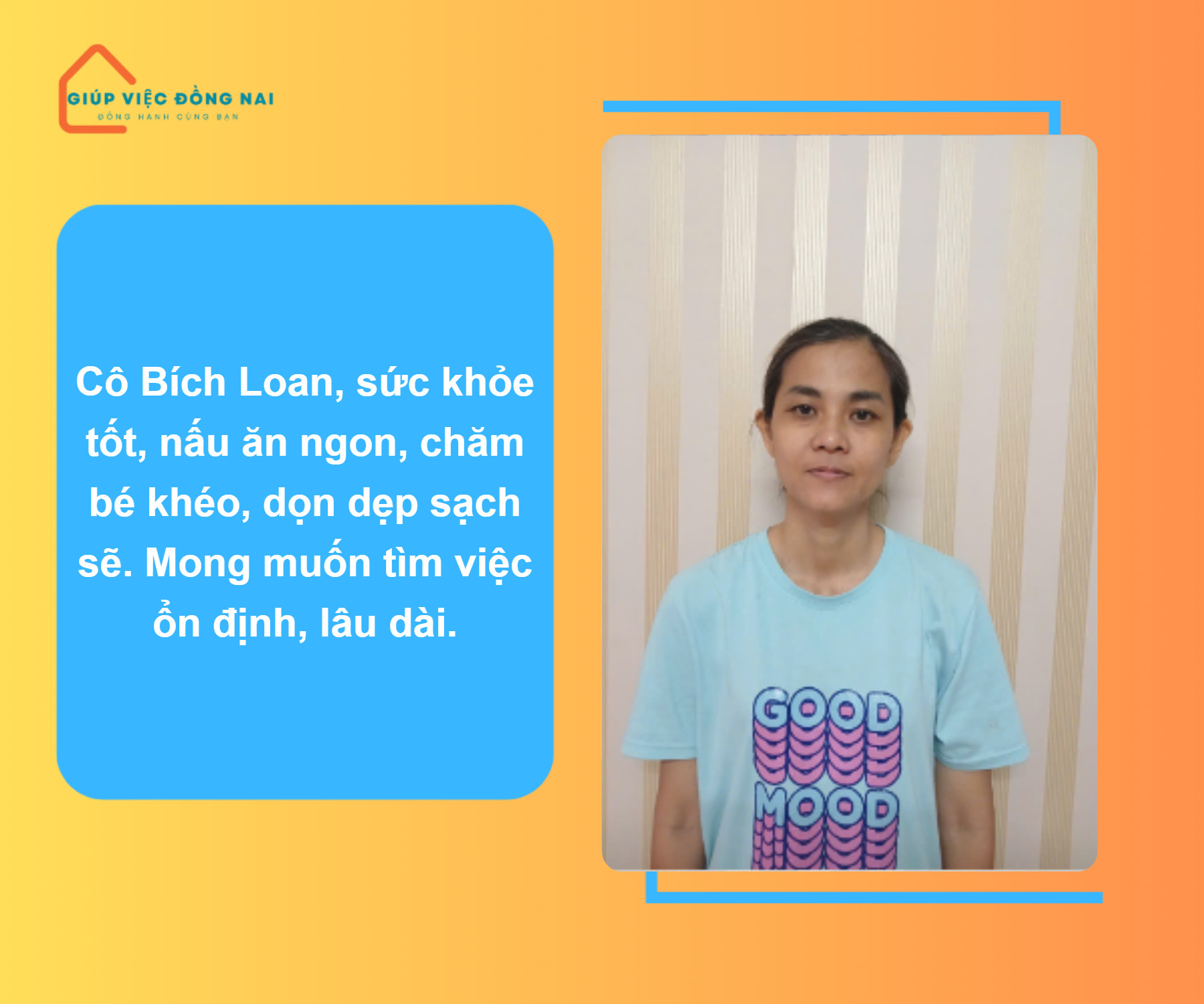 Kinh nghiệm: + Trước đây chị làm công ty ở KCN Biên Hoà 2 + Giữ trẻ tại nhà được 1 năm + Mới đây chị buôn bán tự do + Nội trợ chình trong gia đình Ưu điểm: + Sức khoẻ tốt, không bệnh nền, làm được nhà 2 lầu + Không say xe, không say thang máy + Tự tin nấu ăn ngon khẩu vị miền Nam, nấu được đa dọn món như phở, hủ tíu..bánh canh, chị biết điều chỉnh khẩu vị sao cho hợp với gia chủ + Chị tự tin dọn dẹp sạch sẽ, tự tin sử dụng các thiết bị thông minh, những việc chưa biết chỉ cần nói qua 1 lần. + Yêu thương em bé, cô chăm được các bé từ 6 tháng đến lớn, chăm sóc sức khỏe, ăn uống tắm rửa vệ sinh sạch sẽ, các vấn đề liên quan đến sức khỏe của bé chị đều rất kĩ tính. + Trẻ nhỏ chị hỗ trợ cơm nước, tắm giặt..chơi với bé khi bố mẹ vắng nhà + Chạy xe máy tốt, có thể phụ đi chợ, đưa đón bé đi học. *Tính tình: + Chị hiền lành, biết lắng nghe ý kiến chủ nhà, chị không ngại việc khó + Thiện chí đi làm, chị mong muốn tìm được gia chủ tốt bụng và gắn bó lâu dài