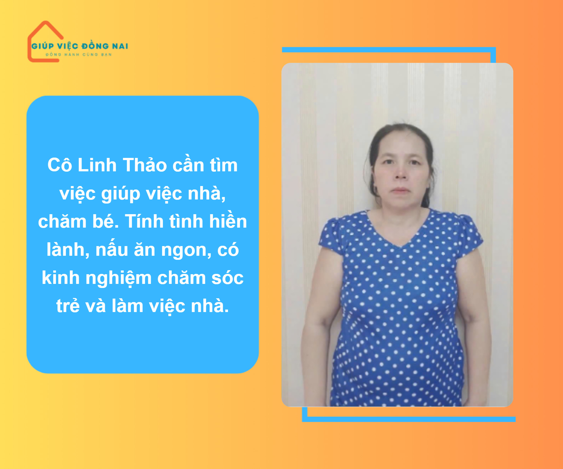 Em Thảo, 44 tuổi, quê Bình Định, hiện đang tìm kiếm công việc giúp việc nhà và chăm sóc bé. Chị có nhiều năm kinh nghiệm chăm sóc trẻ sơ sinh đến lớn, cũng như giúp việc nhà ở Đồng Nai và TP.HCM.