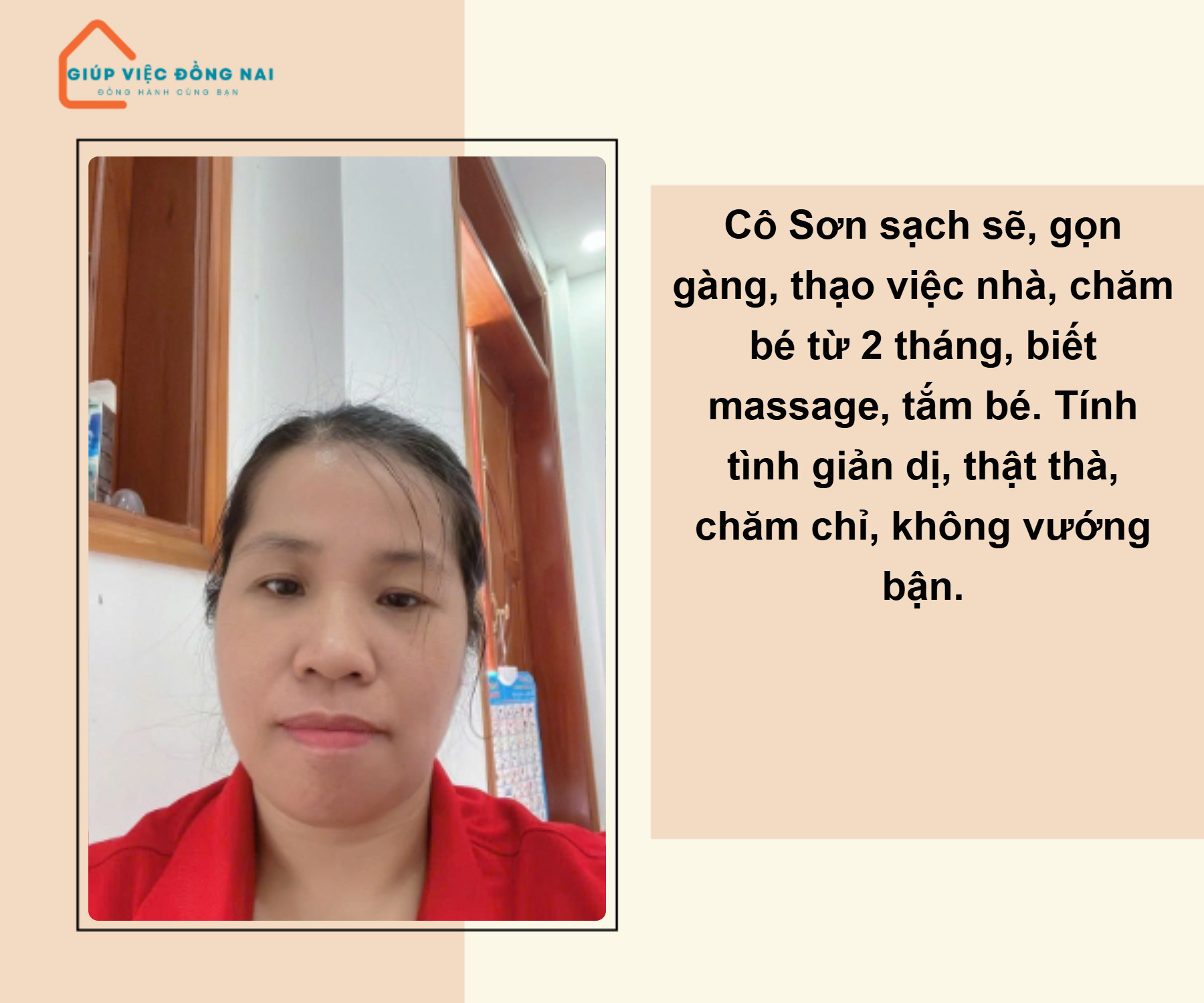 + Tính tình chị là người giản dị, chân chất, thái độ công việc tốt, hiền lành hiểu chuyện, việc nhà cửa nấu ăn dọn dẹp cô có thể phụ làm được.