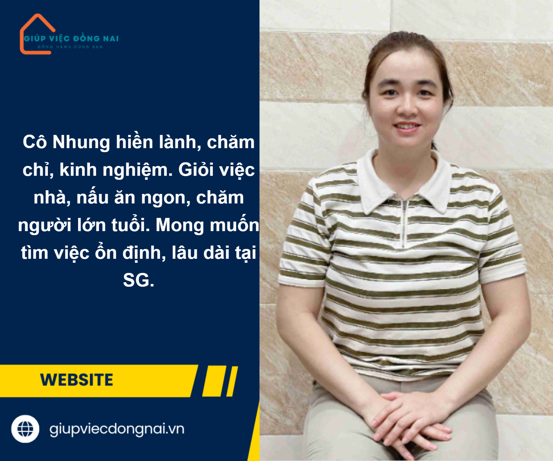 + Chị là người hiểu chuyện, hiểu tâm lý người lớn tuổi, biết cách quan tâm săn sóc cho các bác, không ngại vệ sinh tắm rửa bồng bế. Biết cách trò chuyện cho ông bà ăn, uống thuốc đúng giờ, thức đêm với ông bà được