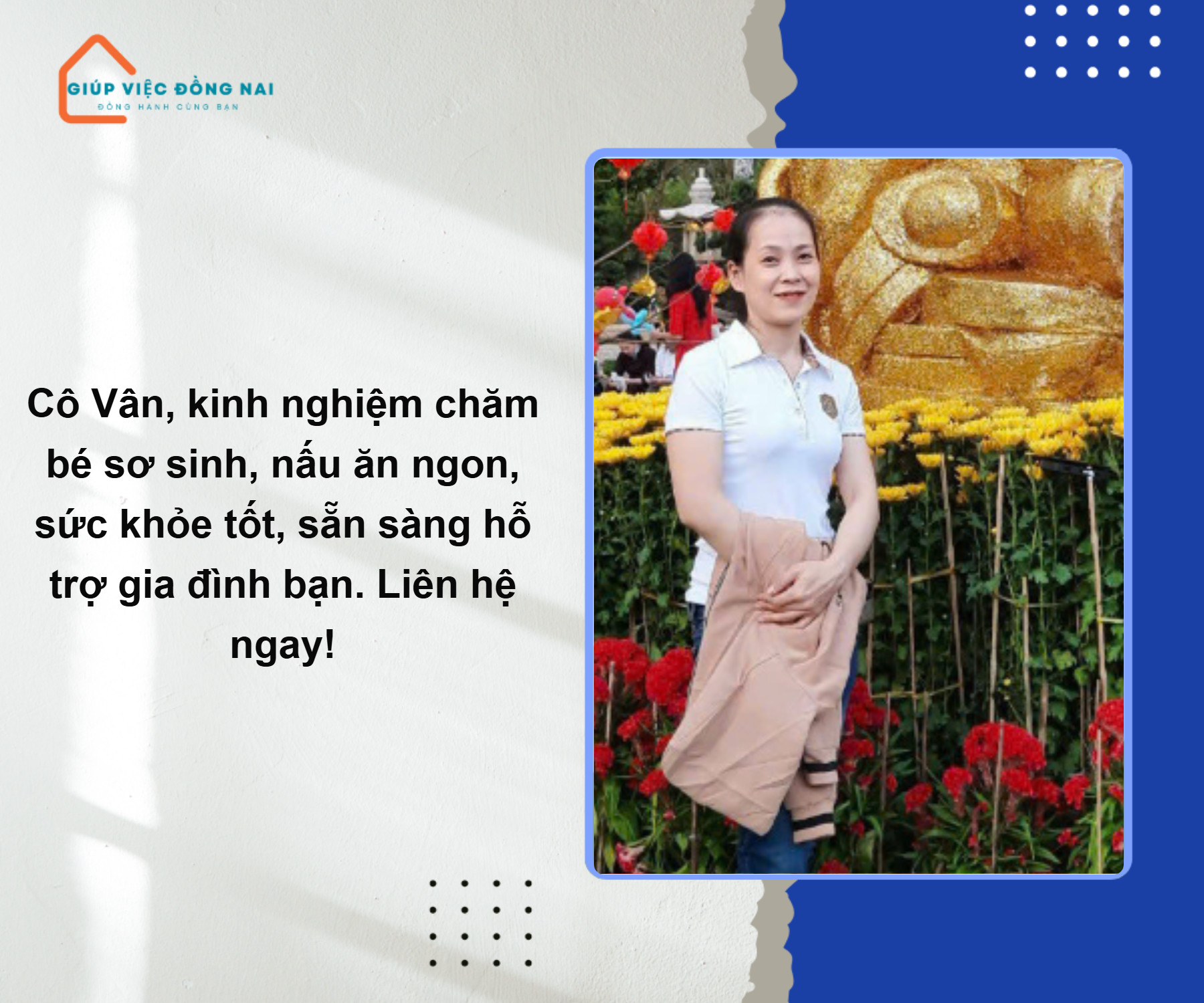 + Chị rất thích em bé, trước giờ chị từng chăm bé từ sơ sinh đến lớn, chăm bụ bẫm tăng cân. Tối ngủ đêm với bé. Chị biết nấu đồ ăn dặm cho bé ( tự lên thực đơn cho bé) , biết sử dụng các thiết bị hiện đại cho bé, vỗ ợ, tắm,…..