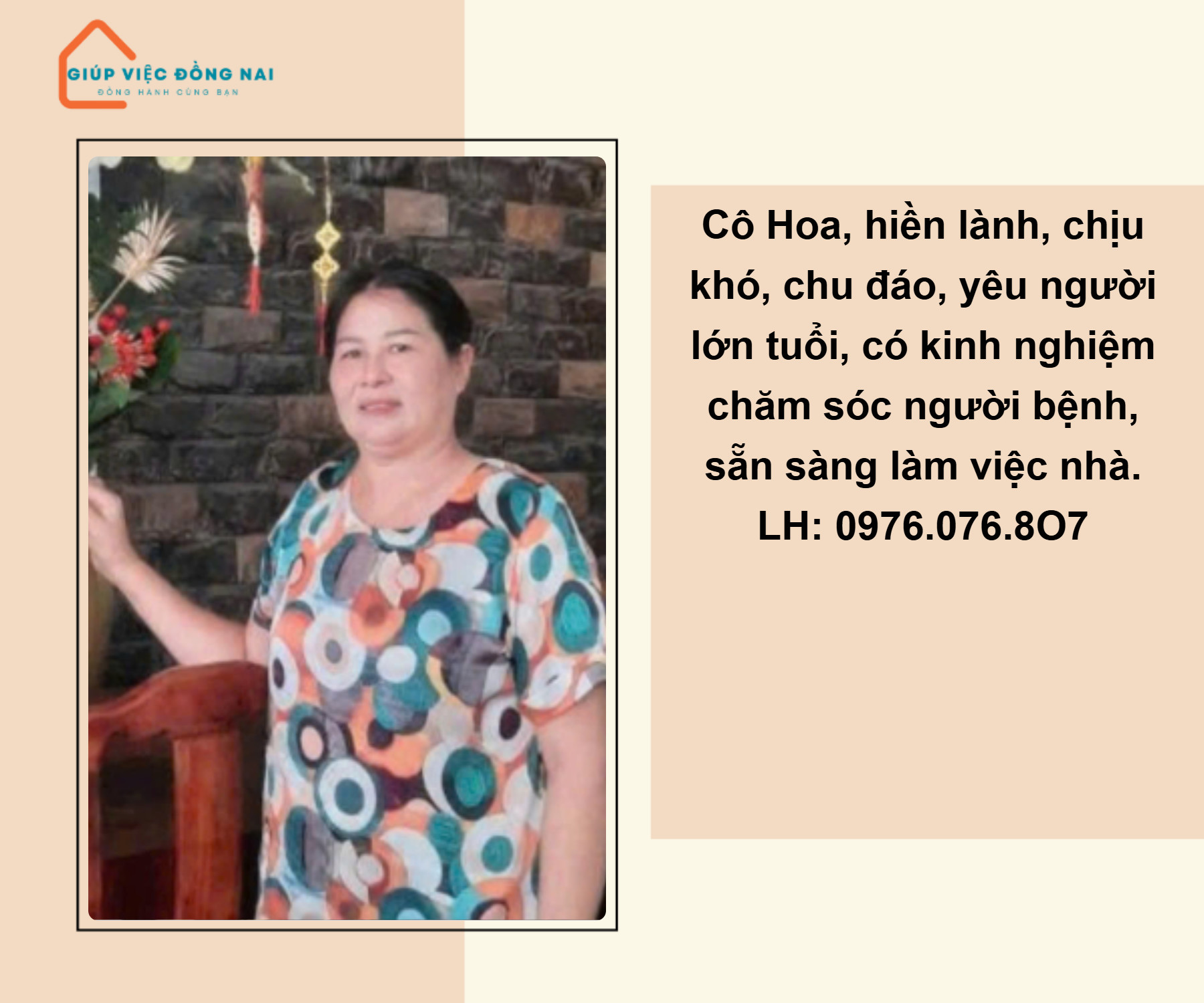 + Chị tính tình hiền lành chịu thương chịu khó làm việc chu toàn trong gia đình, rất vui vẻ nhiệt tình, nên có việc là làm liền.