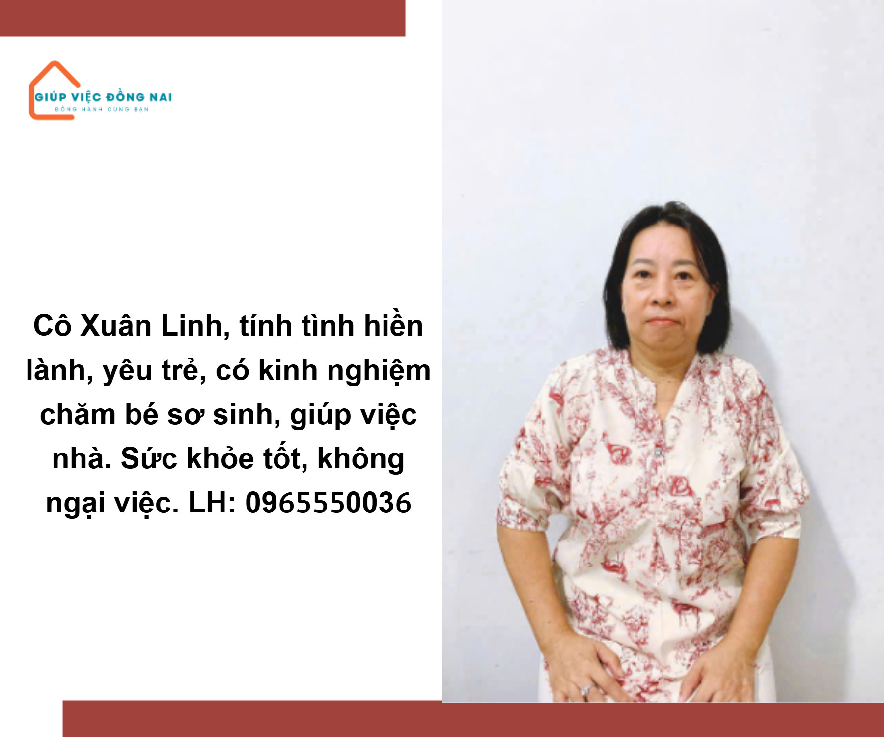 + Chị rất yêu các bé, chăm rất tận tâm, lo cho bé ăn ngủ đúng giờ. Tối có thể ngủ với bé, tự tin chăm giỏi các bé độ tuổi sơ sinh tới lớn